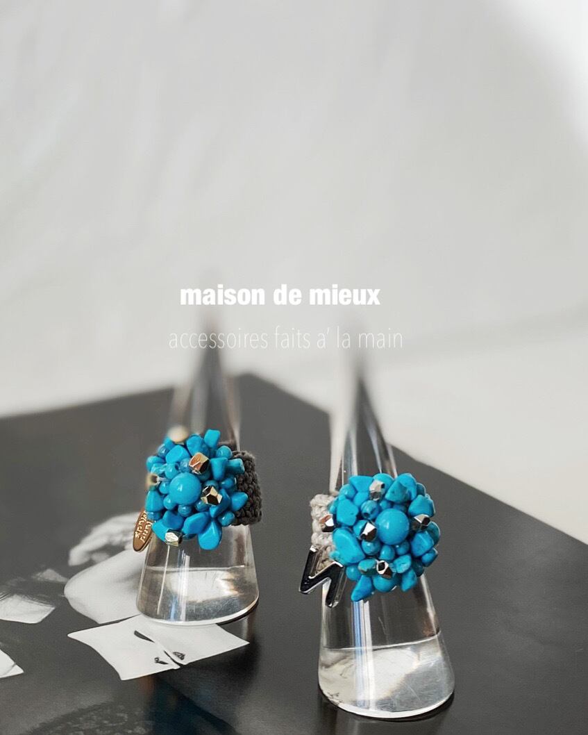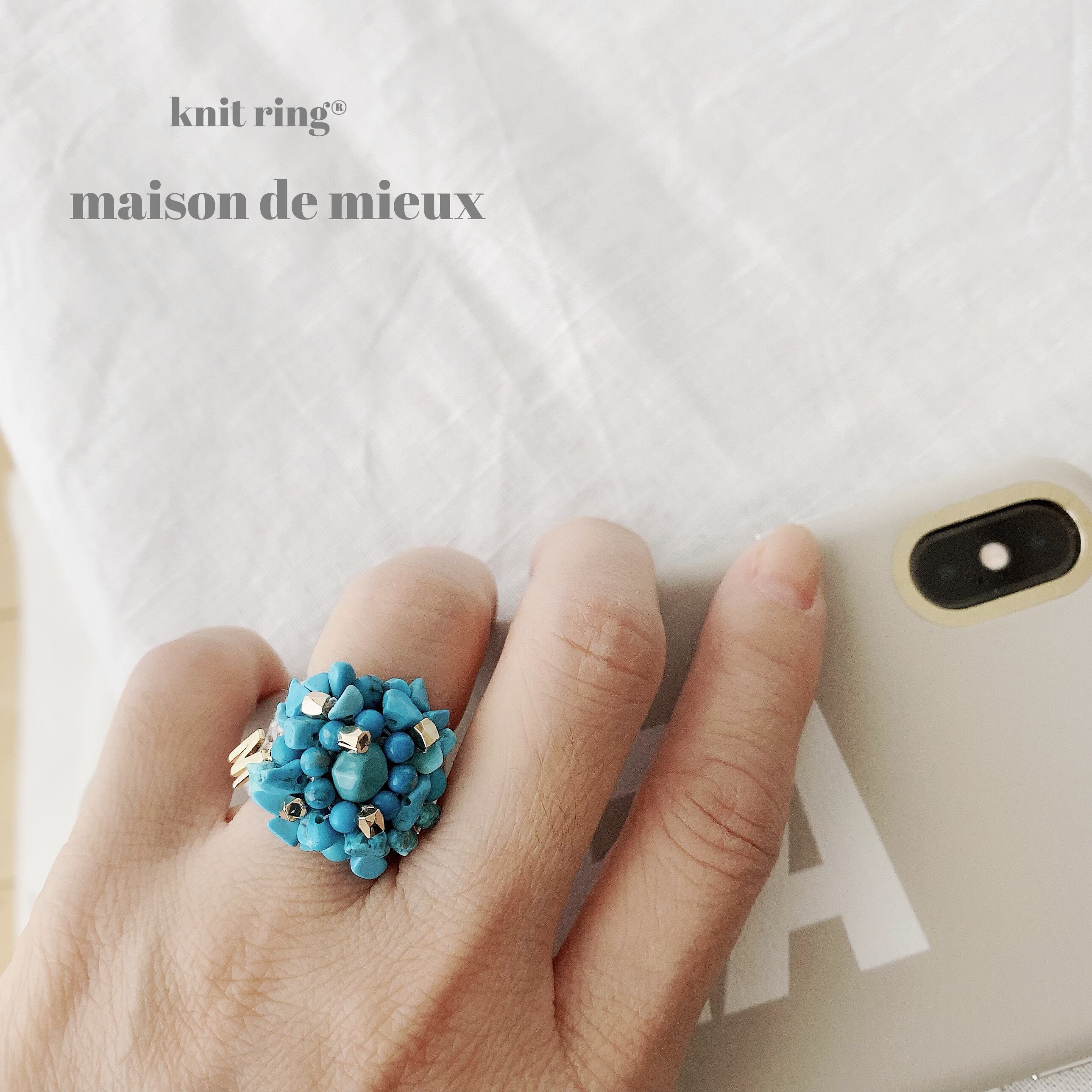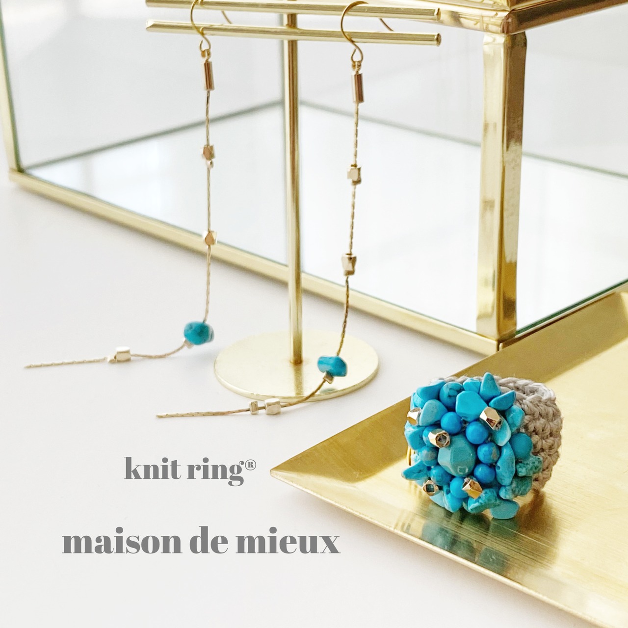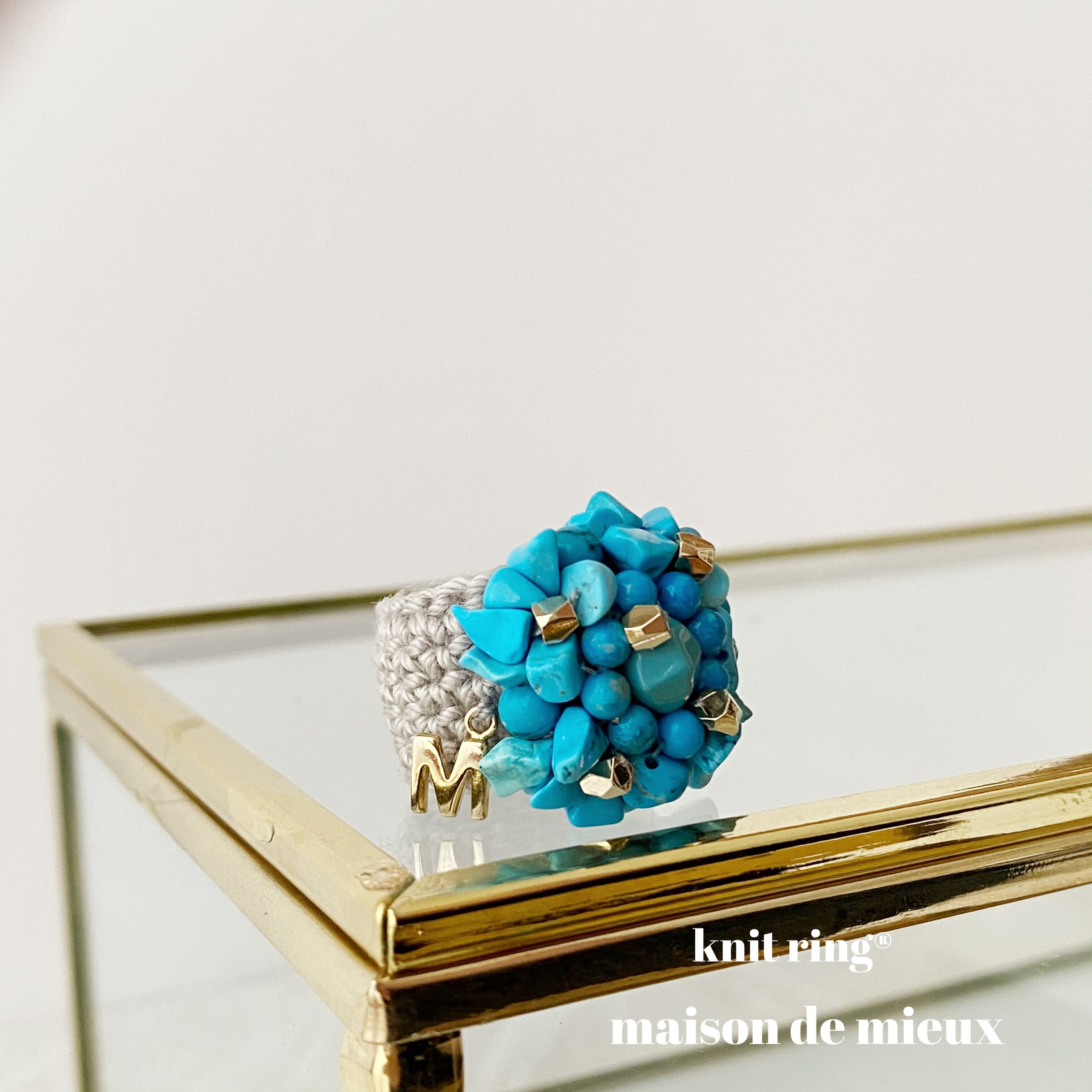 幅広のリングに数種類のターコイズビーズを組み合わせて編み上げたモチーフに、ゴールドのデザインカットビーズを散りばめました。