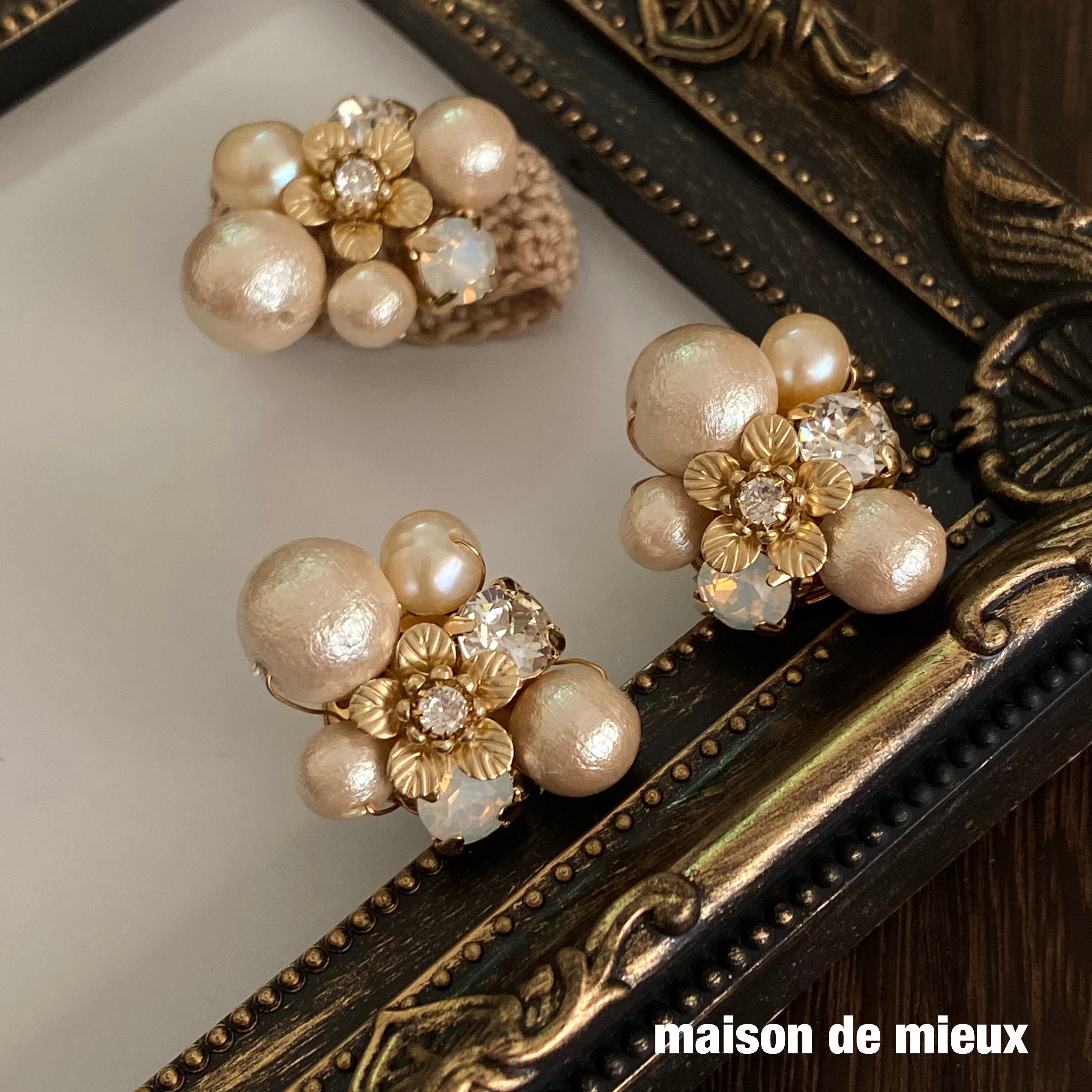 リング土台には肌なじみの良いベージュカラーに大きさの違うキスカカラーのコットンパールをバランスよく配置。