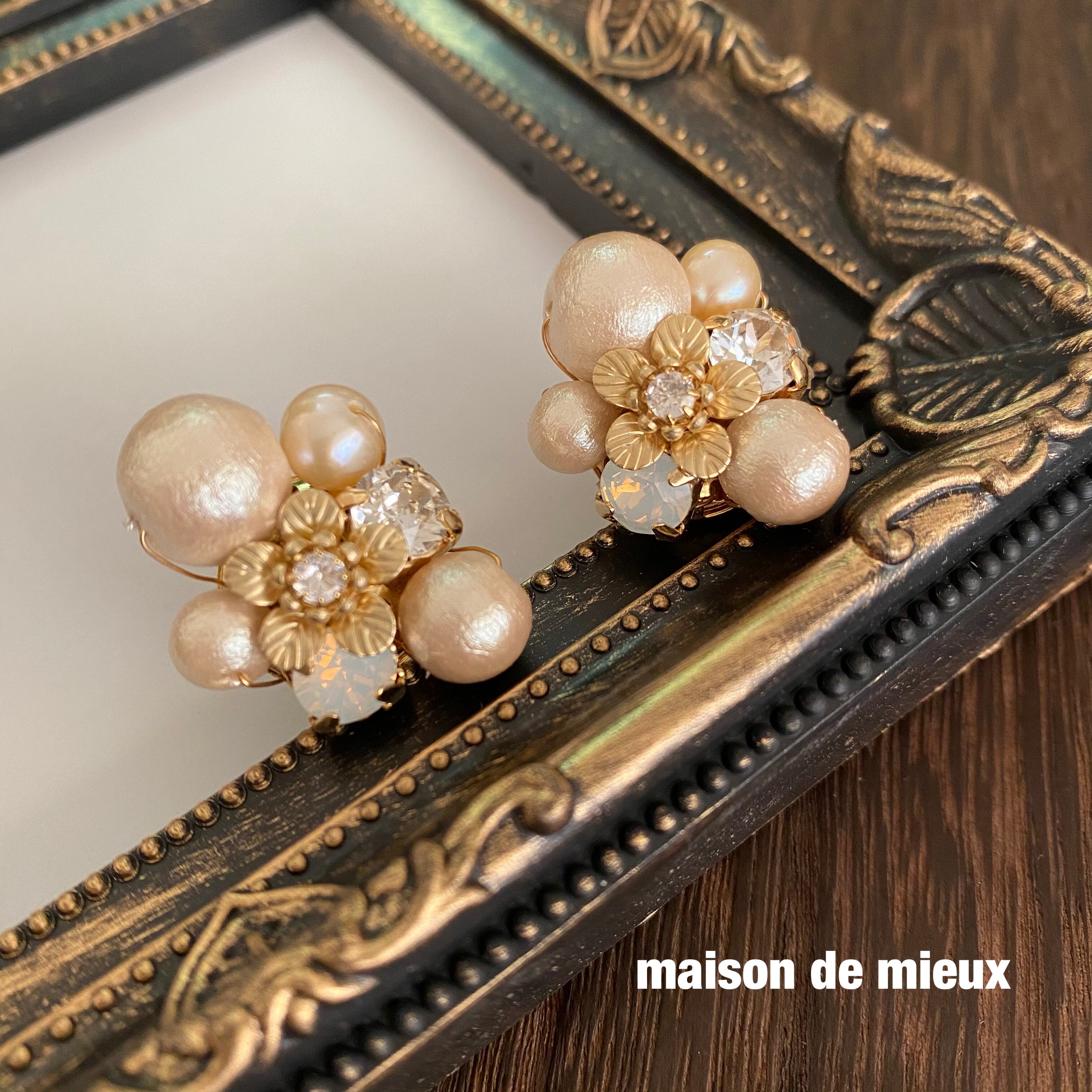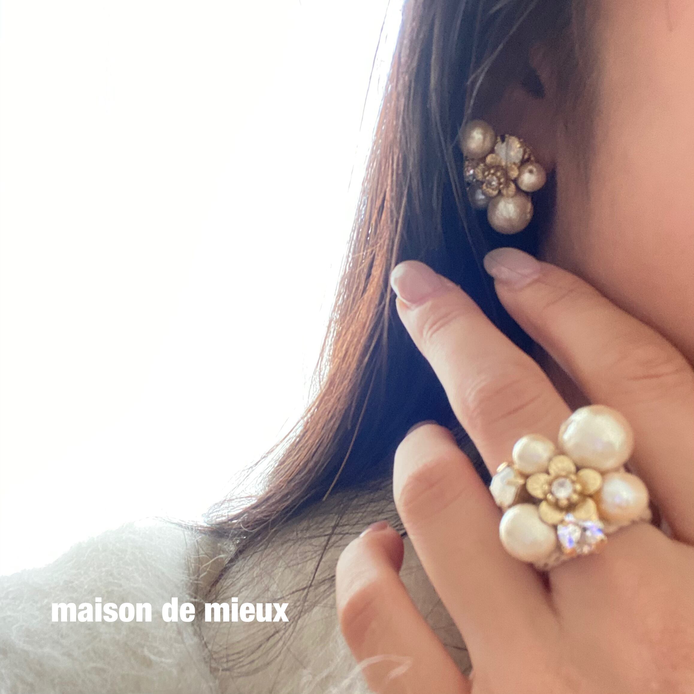 コットンパール、淡水パール、スワロフスキー、フラワーチャームを贅沢にあしらったリングです。
