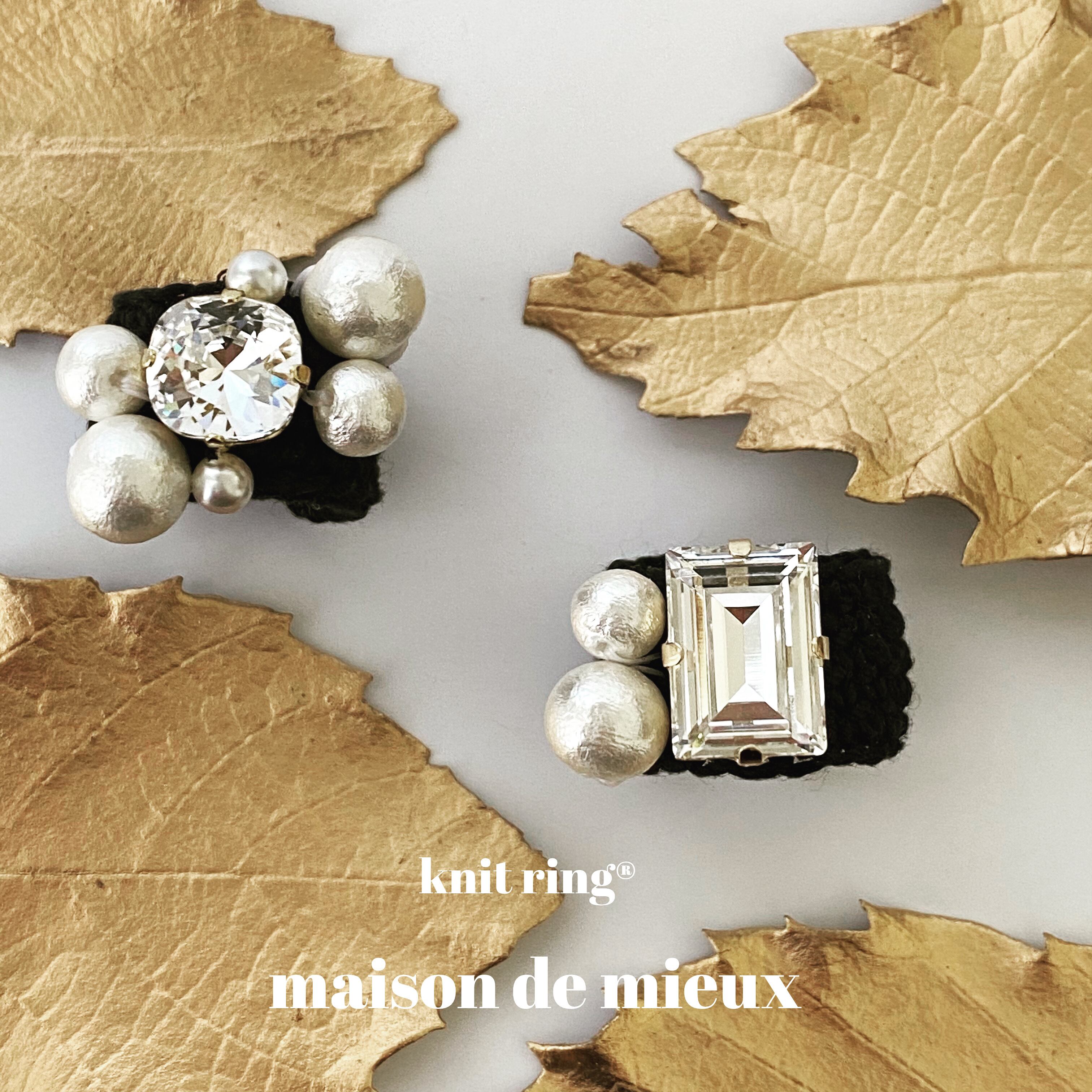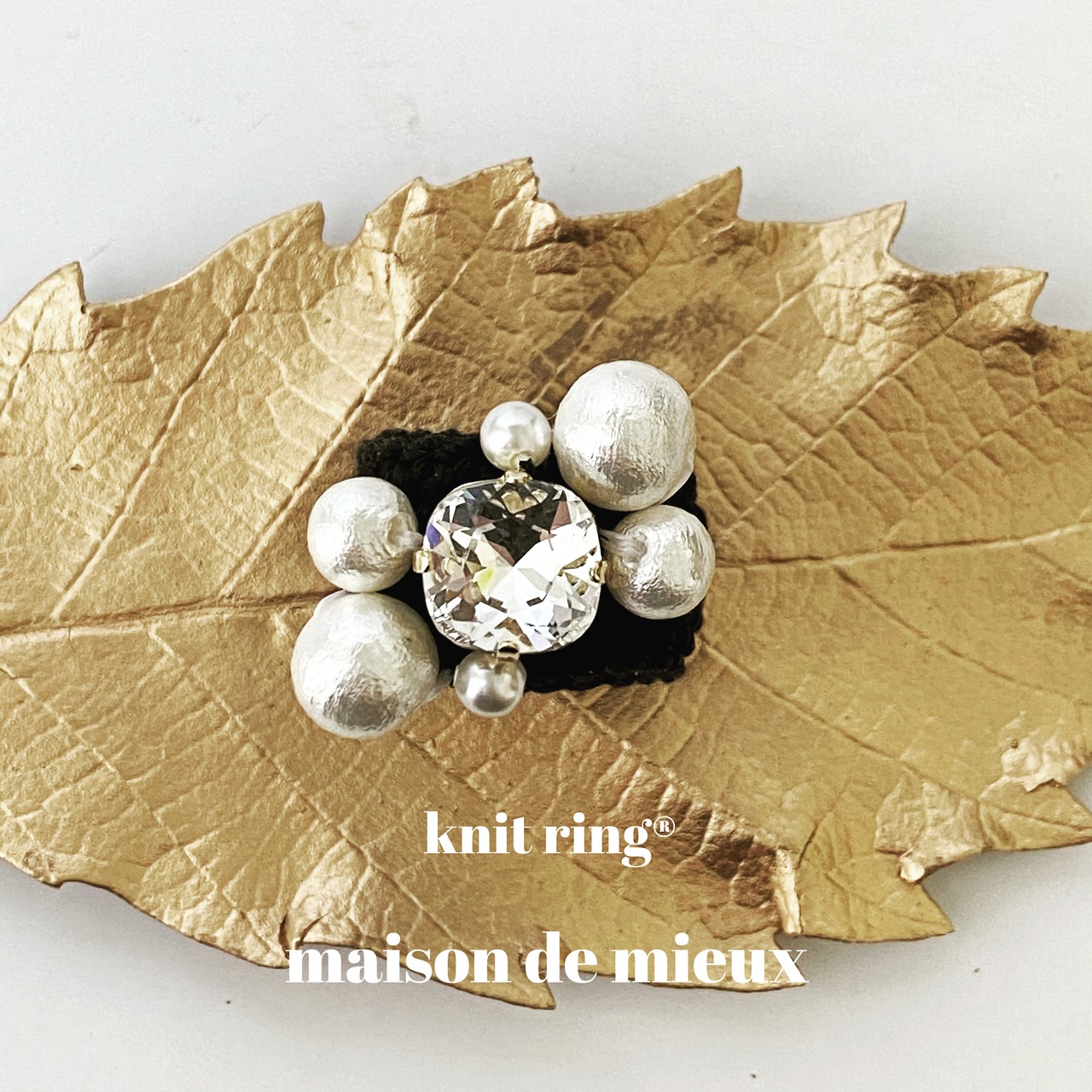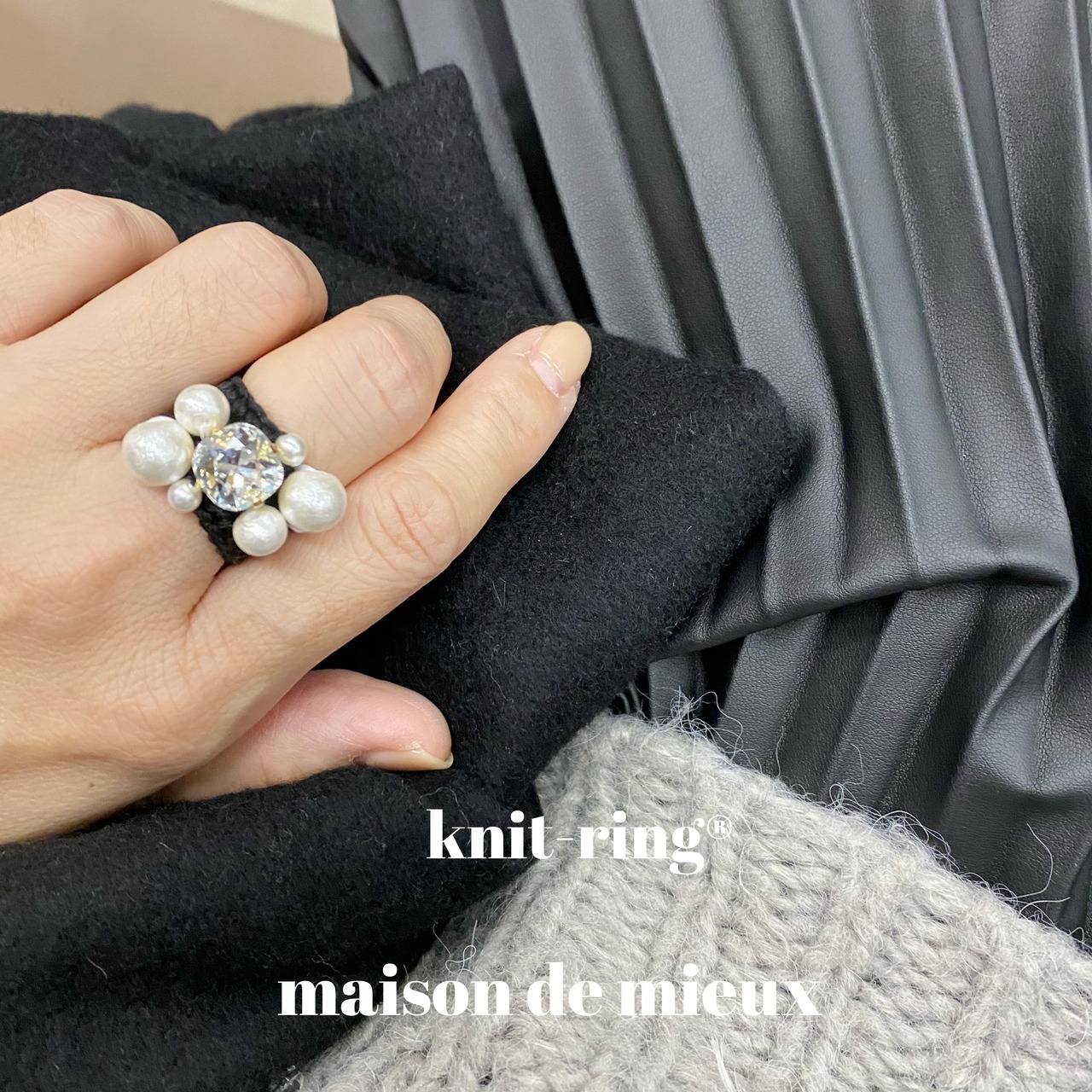 黒のニットリングの土台にサイズ違いのホワイトコットンパール、クリスタルカラーのスワロフスキーとチビパールはスワロフスキーのパールを使用。