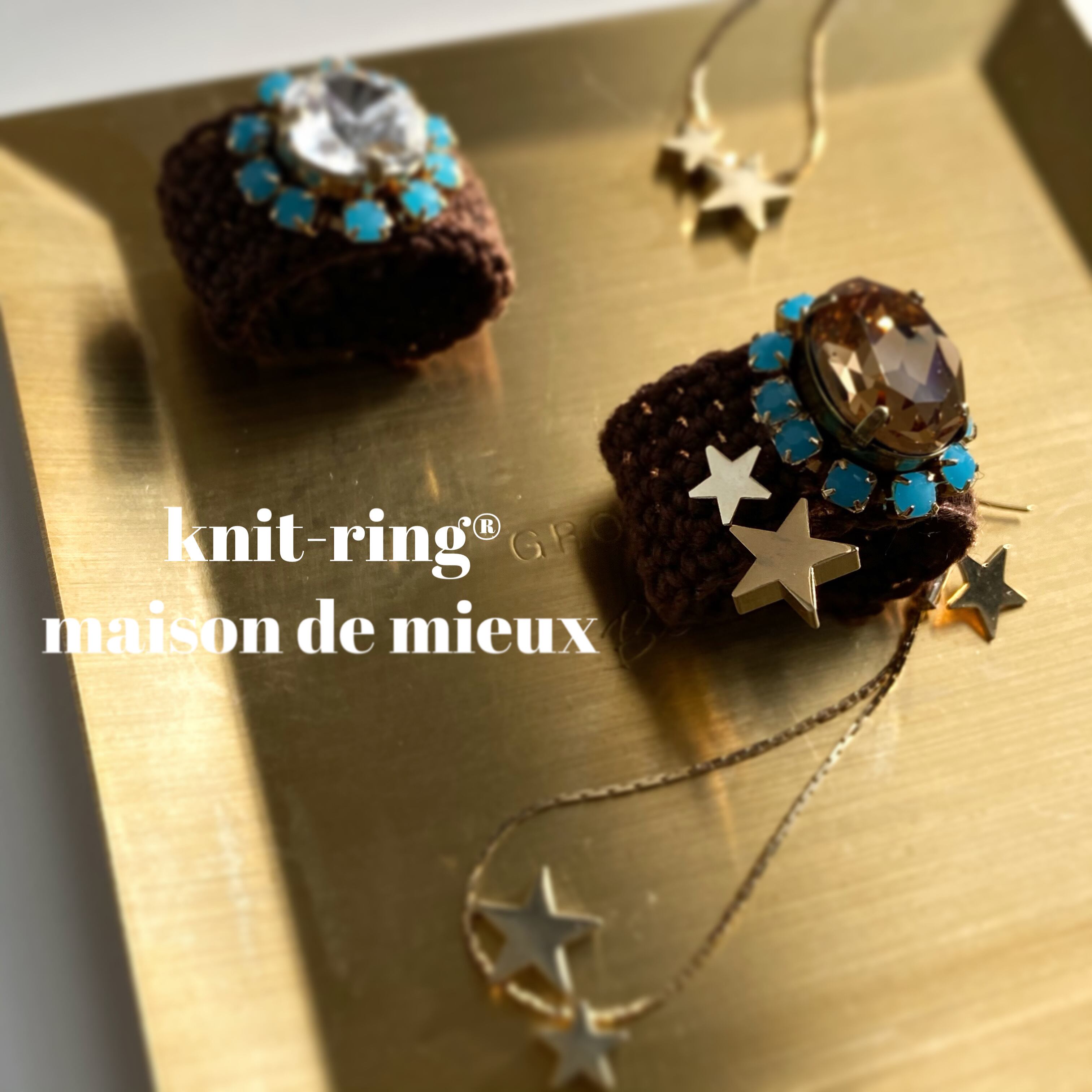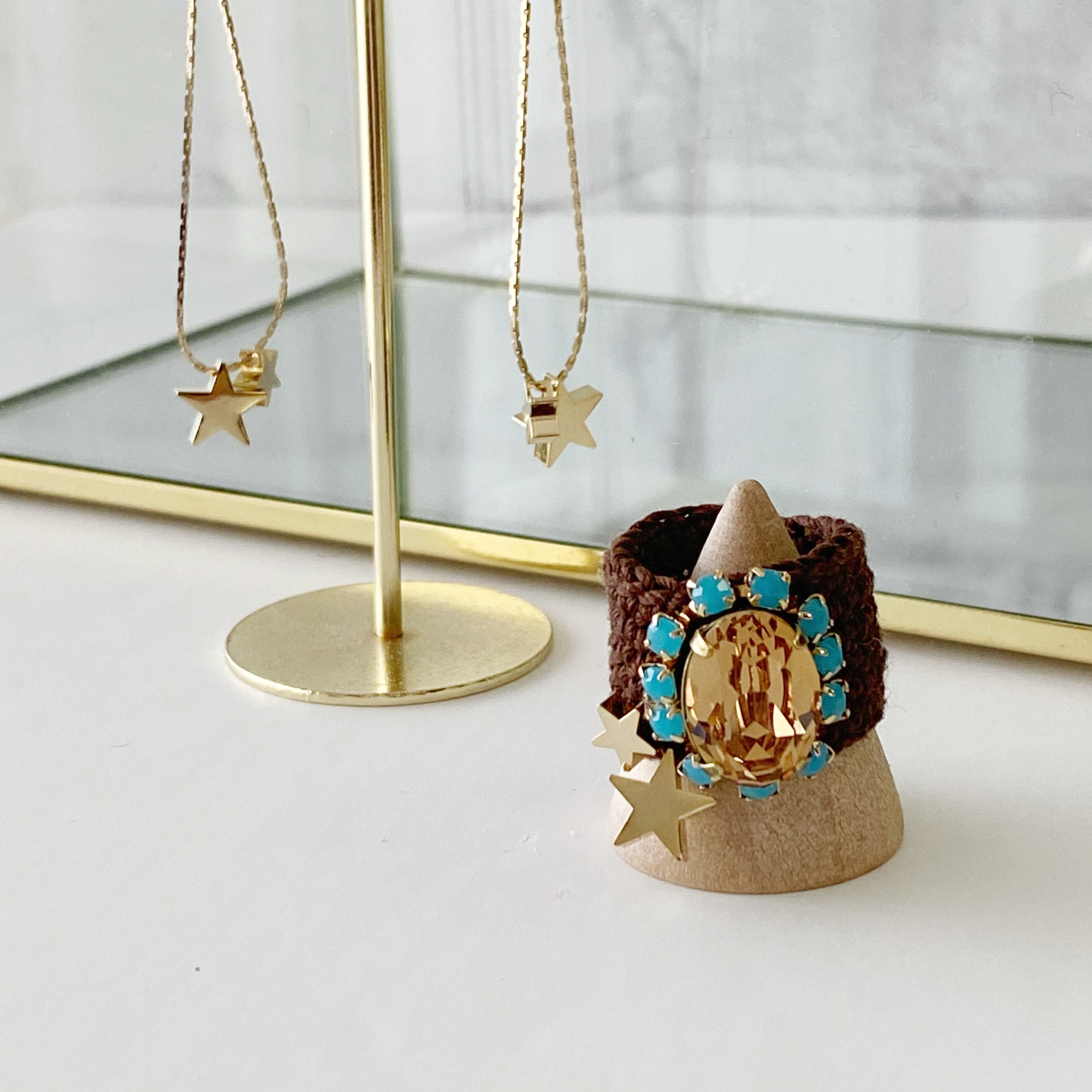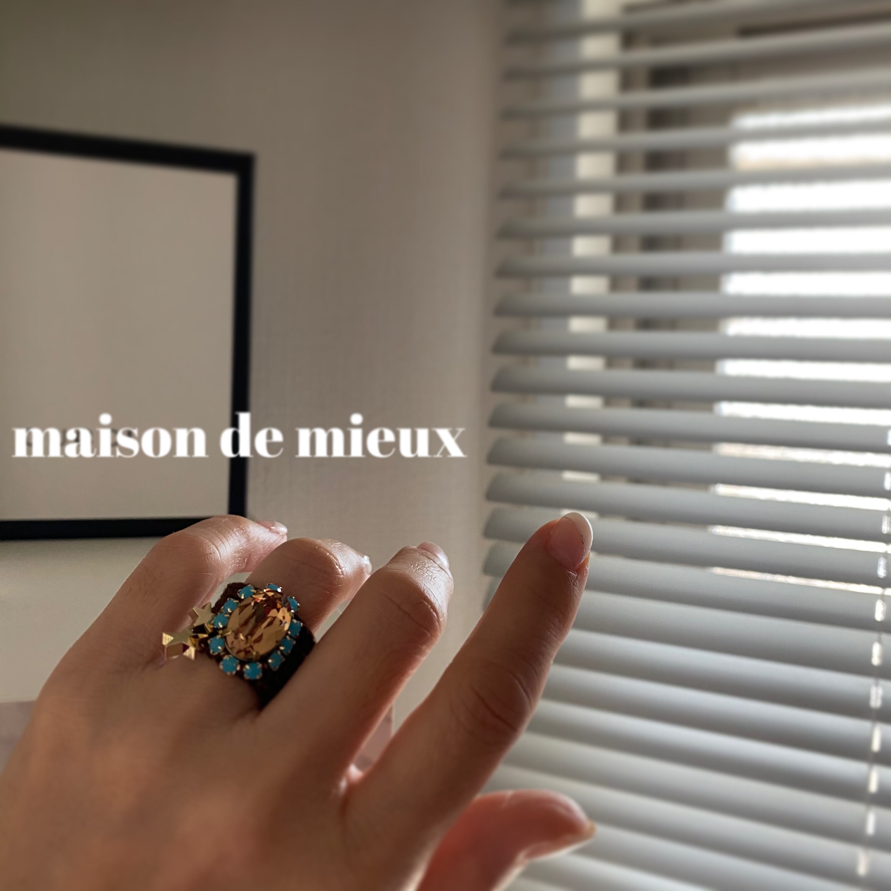 チョコカラーの幅広リングに素肌に馴染むコニャックのスワロフスキー の周りをターコイズのガラスチェーンで囲みました。