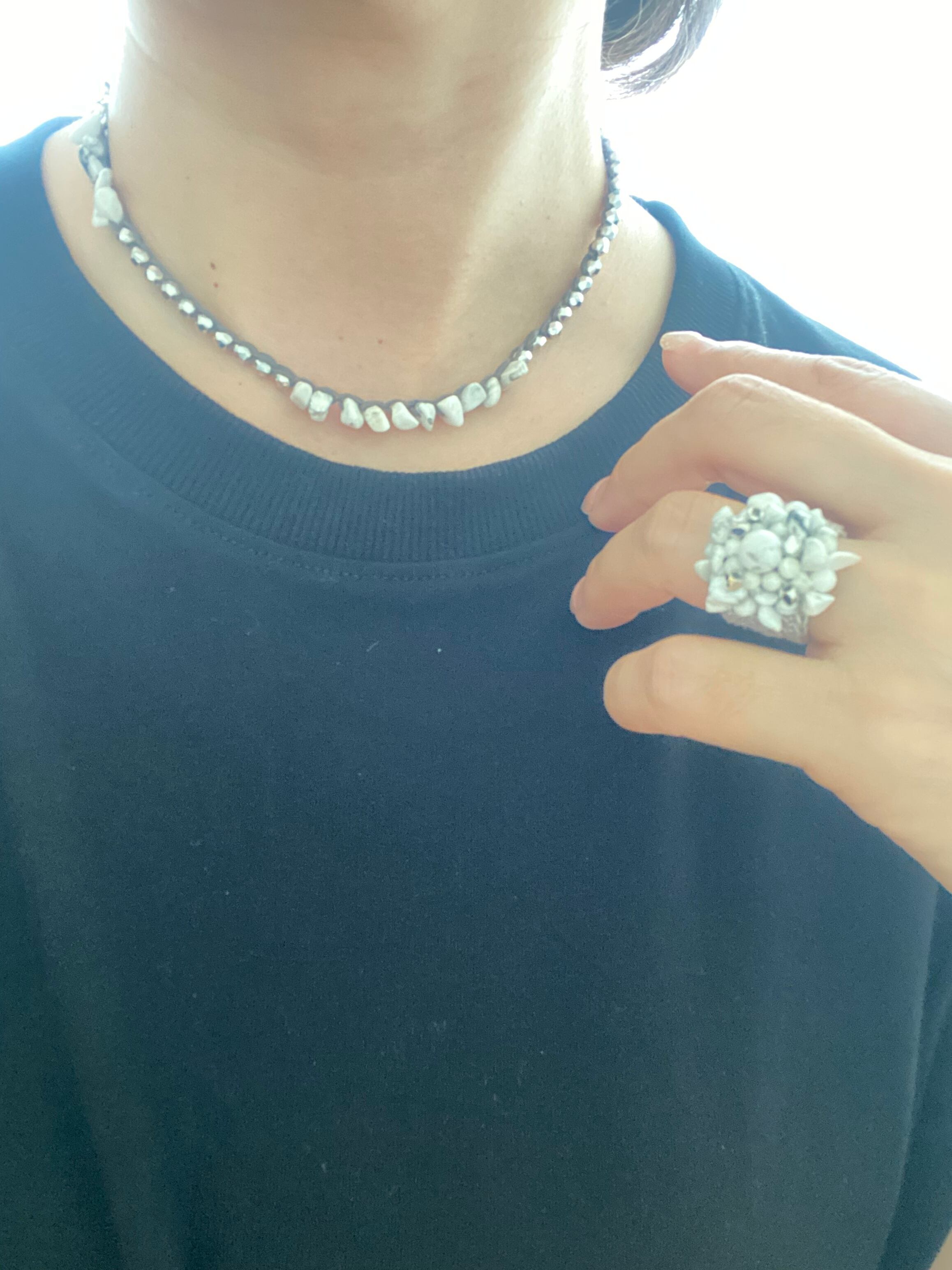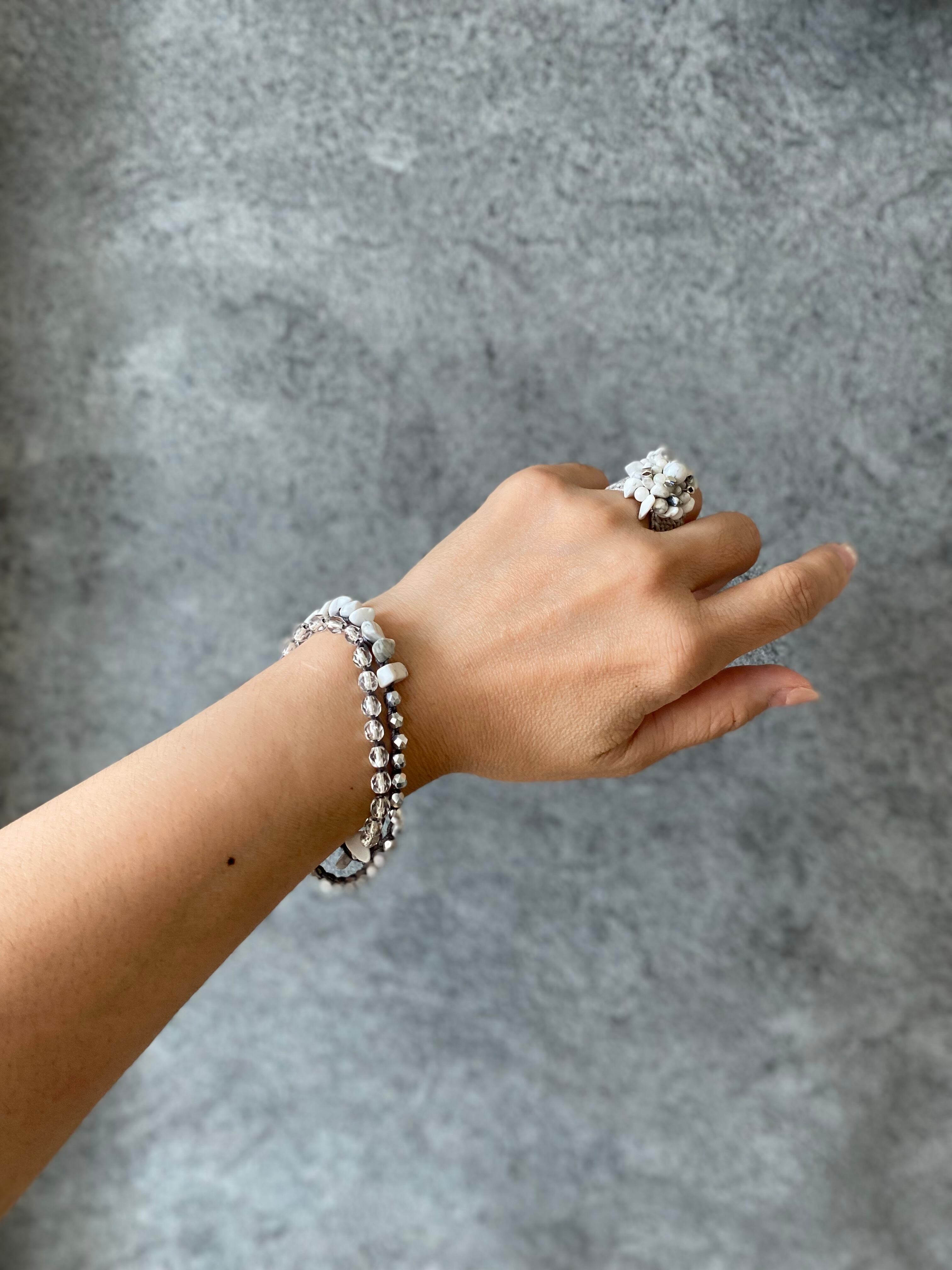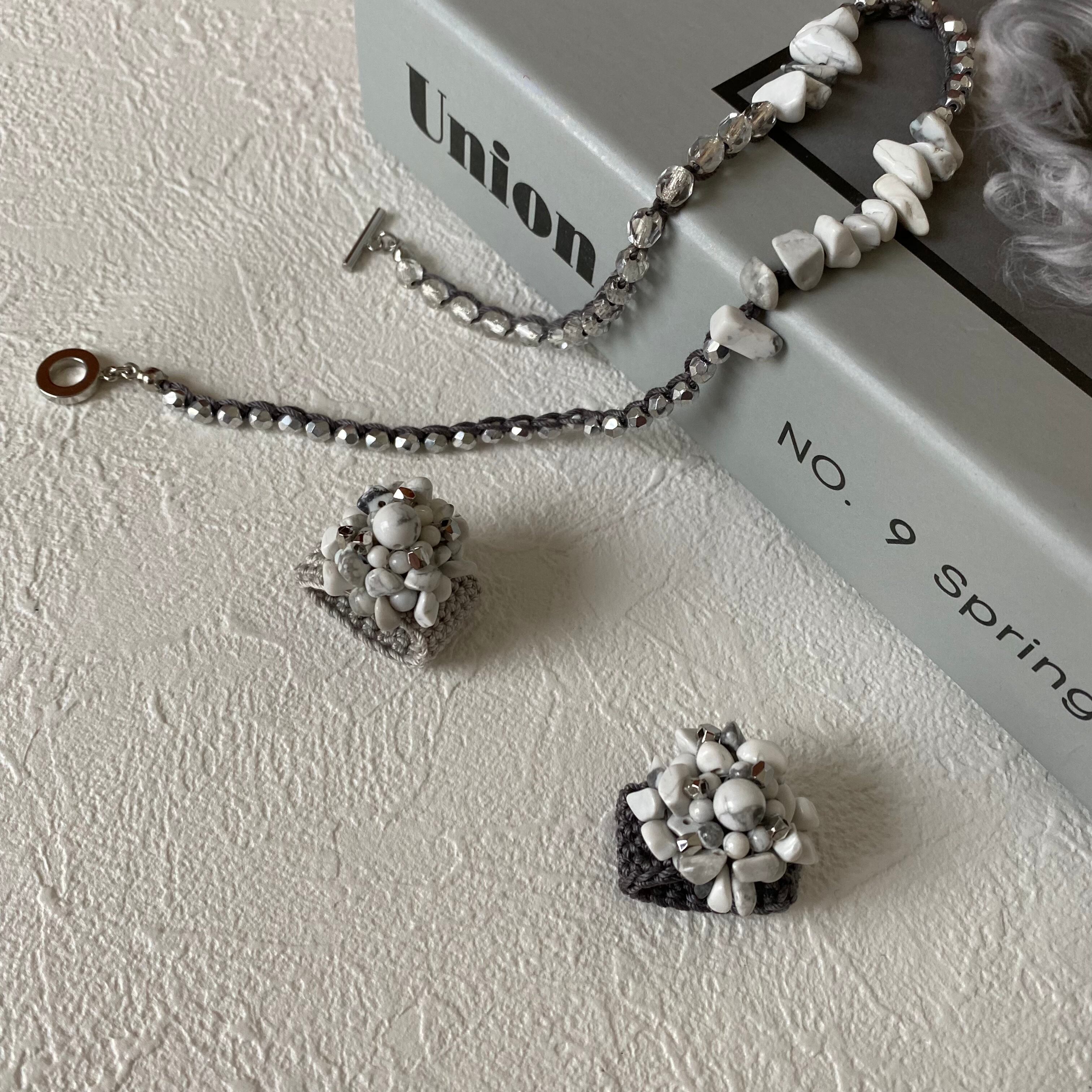 真っ白の天然石ハウライトを立体的に編み上げ、シルバーカットビーズでアクセントをつけました。